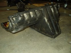 Obviously this car has leaked oil for some time. Now that the oil pan is exposed, it was easy to get in there and see how to remove it. 22 bolts later and off she came. I guess I should elaborate on that. With the oil pan unbolted, the damn thing wouldn't budge. I wiggled for a minute and it finally broke free. Cool, I thought. I wiggled some more and got hung up on the oil pickup tube. No biggie, I thought, this was mentioned in the procedure and I knew not to force it. After 10 minutes of trying to get the damn thing off, I called Joe Paluch, who was nice enough to talk me through it. A few minutes later, the dirty SOB was in my hands and free from the clutches of the equally dirty engine.