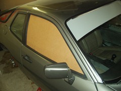 I rather liked having windows, due to the fact that I drive the car to and from events (for the time being anyway). The solution came in the form of 1/4" thick plexiglass sourced online for $30 shipped for enough to do both sides. I traced the stock glass onto the paper backer of the plexi and my brother so kindly cut them out for me. With the rough edges filed down, it fit pretty damn well. I did have to use an air sander to trim a few high bits, but that was my fault by drawing the lines like a drunk.