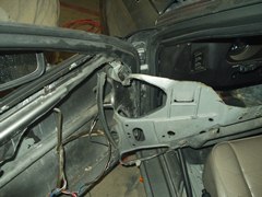 With the door panels off, windows and related BS removed, I began feverishly cutting. Then bending. Then cutting some more. Then bending. Then drinking a beer and inspecting the burn marks from flying molten metal. Then finally muscling the damn section out.
