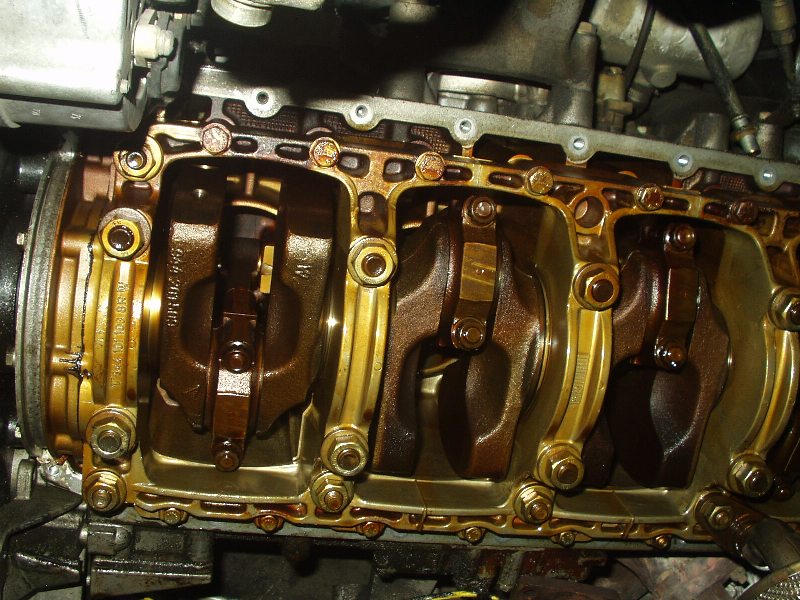 Okay, back to the matter at hand. I was a little intimidated by removing the rod caps because I know how much time, money and effort it takes to replace a damaged crankshaft. Once I realized you could knock them loose by tapping on the con rod studs, I was able to keep all the hard stuff off the crank. I used plastigauge to check the clearings and I was happy to discover that I was well within factory limits (see small green 'smudge' on the bearing below).